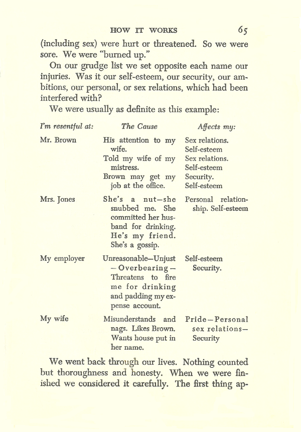 Many of us have heard people say things like “Other people cannot hurt me unless I allow them to do so.” There is a some truth there, of course, but learning to choose our friends, associates and even our companions wisely is not what we are doing at the moment. Right now we are looking at the fact that all human beings, including ourselves, are affected by the actions of others — our own personal injuries and injustices are presently being listed in Column Three — and Step Four is also about learning the fact that our lives being driven or controlled by our anger and resentment does not work well (and never could have or ever will) in relation to finding satisfactions of our natural instincts and desires. So overall, do not fall into the temptation of the ego or intellect trying to philosophically avoid or resolve anything here. Rather, just continue on with these Twelve Steps that ultimately show us what actions to take (even against our own thinking or “old ideas” as mentioned on page 58) as we thereby learn a new manner of living that really does work even when some of the very best people around us might still let us down once in a while!