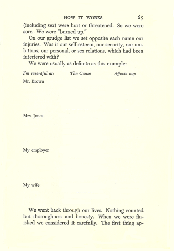 Aside from confusion, the second obstacle some of us have encountered at Step Four has been in the short-sighted belief we had no resentments. If that might be your own case, that is fine…just proceed by making a list of “people, institutions or principles” (page 64) with whom you are or have ever been angry. Anger is a natural and normal human emotion each of us has experienced or felt in relation to one or another “person, place or thing” at one time or another…